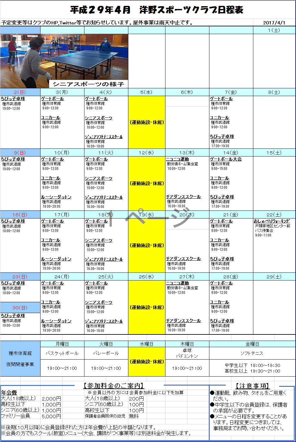 皆様へのお知らせと平成29年4月の日程をupします。