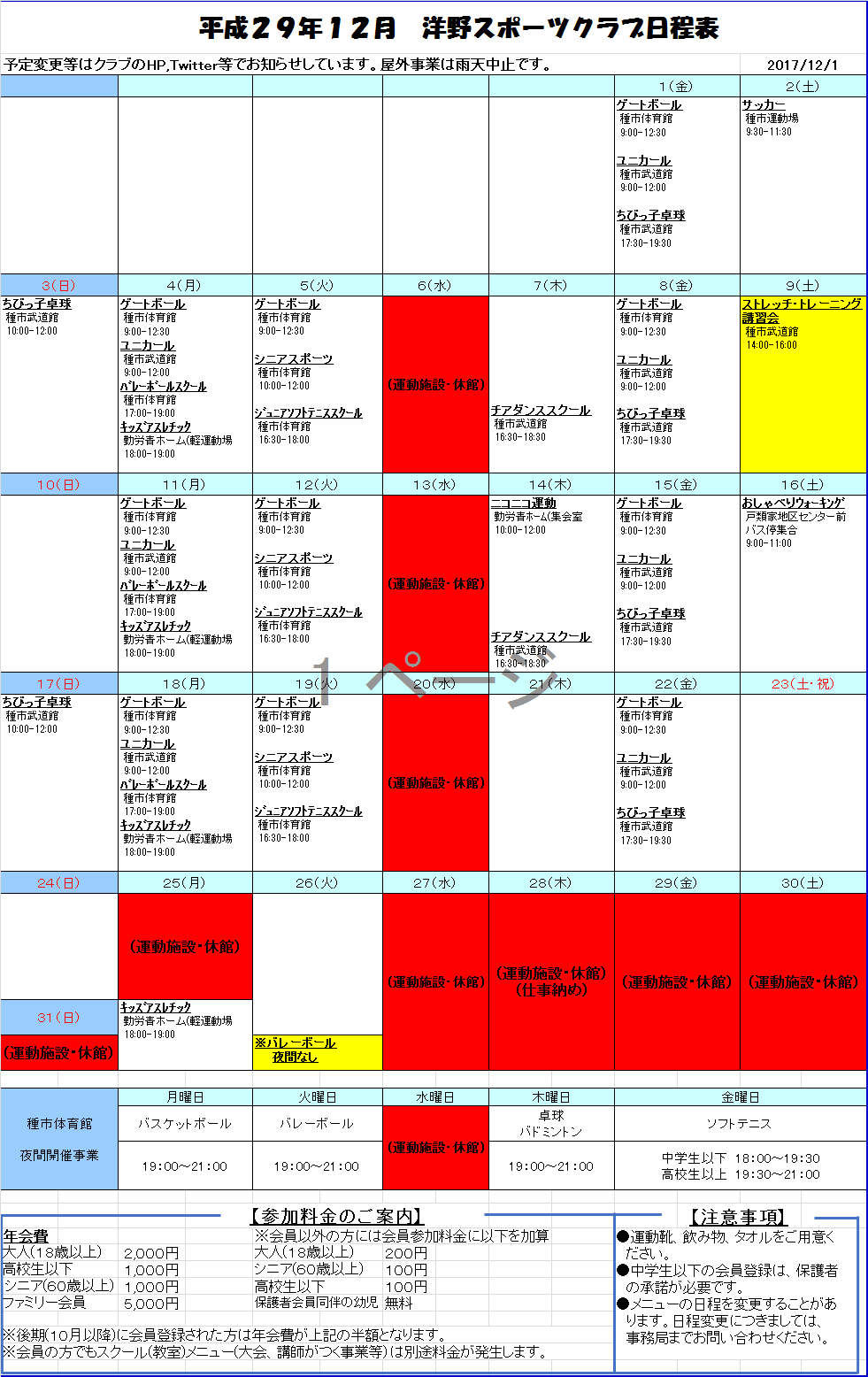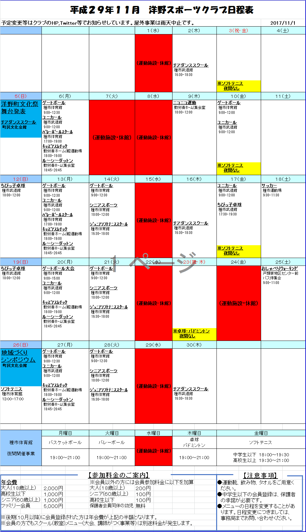今月は金曜日の夜間事業(ソフトテニス)がありませんので、お間違えのないようお願いいたします。