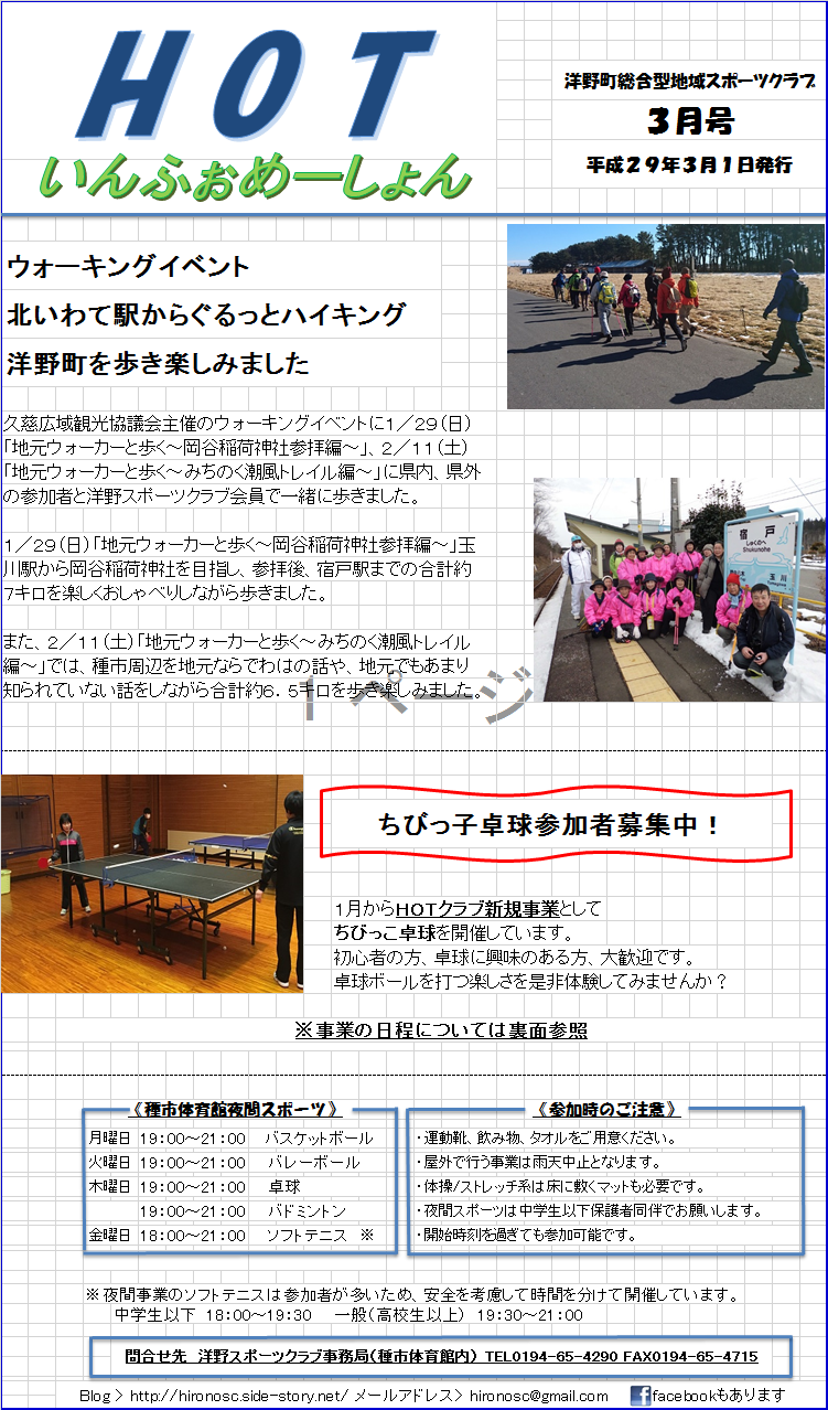 岩手県洋野町(ひろのちょう)の洋野町総合型地域スポーツクラブ(洋野スポーツクラブ)のBlog(ブログ)です。  当クラブは2012年2月末に生まれました。  洋野町総合型地域スポーツクラブ(洋野スポーツクラブ)の略称はHOTCLUB(ホットクラブ)ですが、HOTの由来は「Hirono(洋野)町は旧Ohno(大野)村と旧Taneichi(種市)町」が合併してできた町であることからきています。HOTには『クラブが会員らに熱っちく支持され、熱っちい事業を展開でき、町全体がますます熱っちいという状況を作っていければいいね!』という願いが込められています。    このBlogはクラブ会員や洋野町ゆかりの皆様向けに、スポーツクラブ事業関連のお知らせや地域のイベント開催の様子などを発信しています。 成熟しきった大人が溢れる洋野町(65歳以上の人口が多い)からの情報発信をお見守りください。   当クラブは「町民の皆様の健康増進に貢献するHOTCLUB!」「町の宝物、子供達の健やかな成長に貢献するHOTCLUB!」「町民の皆様の健康がクラブの幸せ!」をモットーに運動の場を提供する活動をしております。 なお、洋野SCはtoto(スポーツ振興くじ)の助成を受けて運営しております。 totoは岩手県内で買いましょう!!   facebookはこちらhttps://www.facebook.com/hironosc